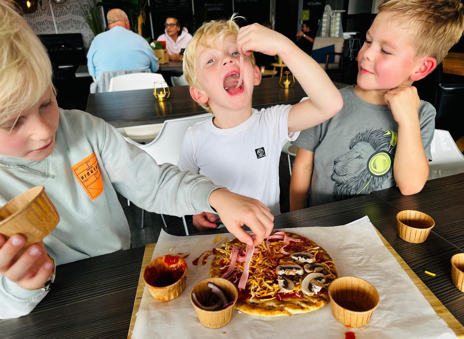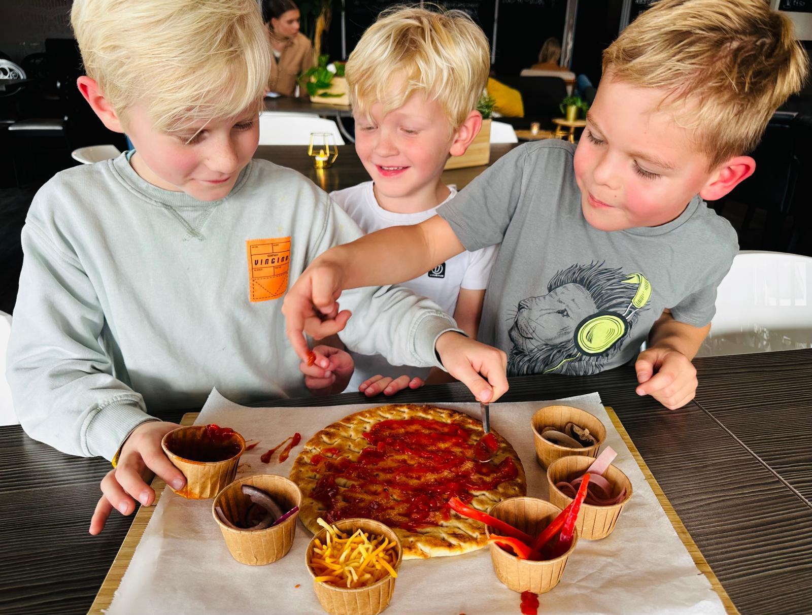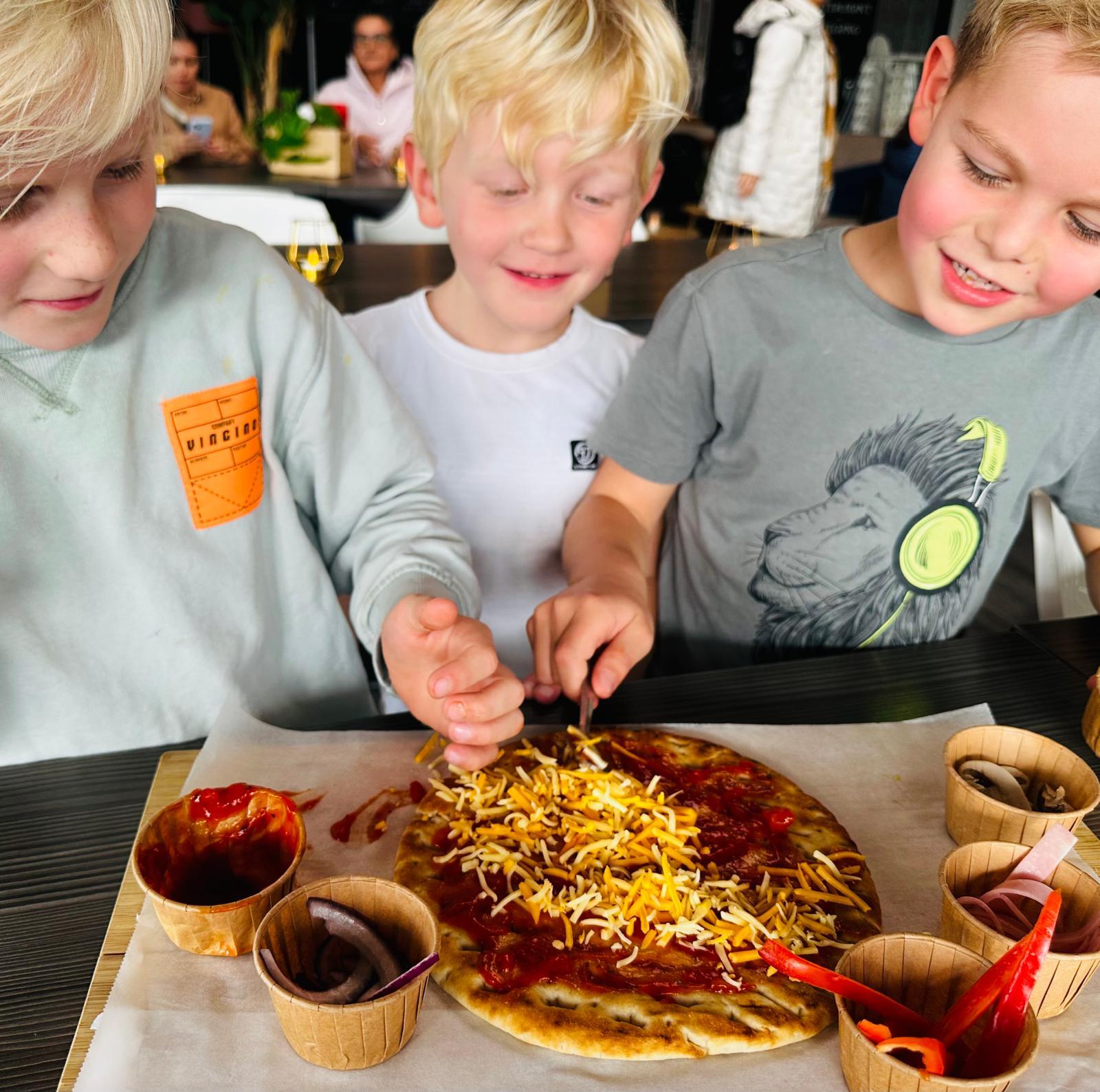 De kindjes maken hun eigen pizza en wij bakken hem af. Smullen!!