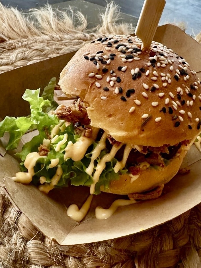 Het is of een sateetje voor allemaal of voor iedereen een burgertje dit geef je vooraf bij je reservering door.