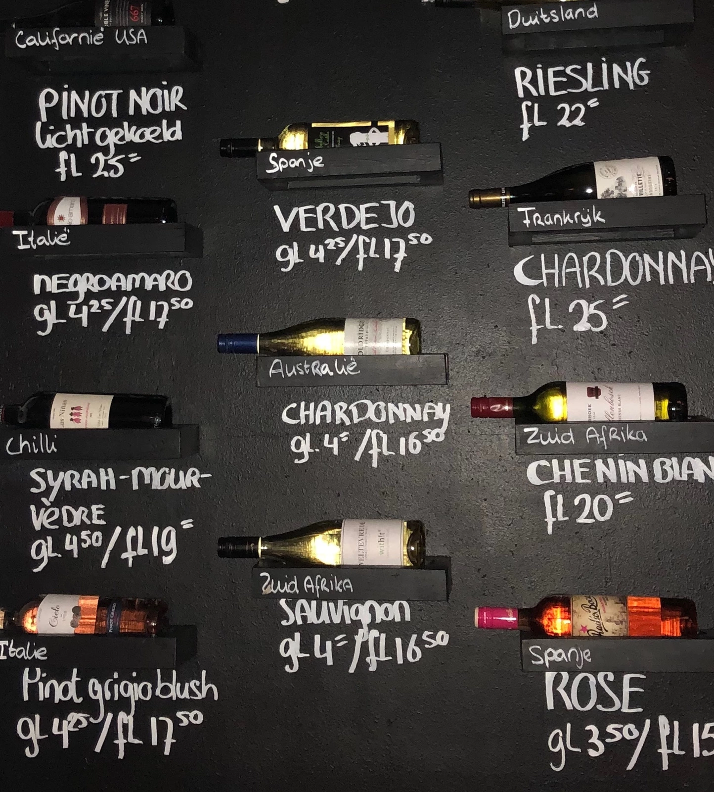 Wine wall; Apart from our house wines that we serve by the glass, we regularly change our wine wall.